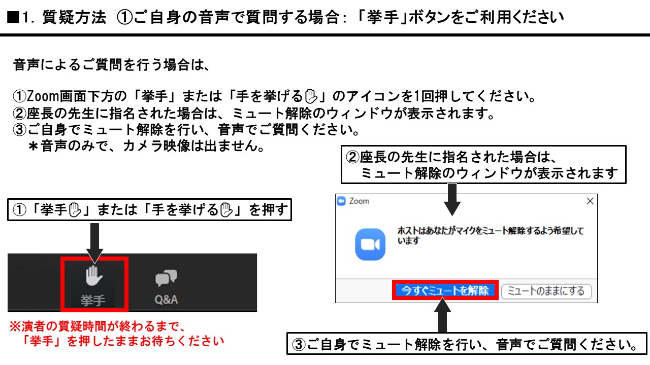 - ・座長・演者以外の参加者(視聴者)は、質疑応答の際に、座長に指名された場合に限り、音声による参加が可能となります。