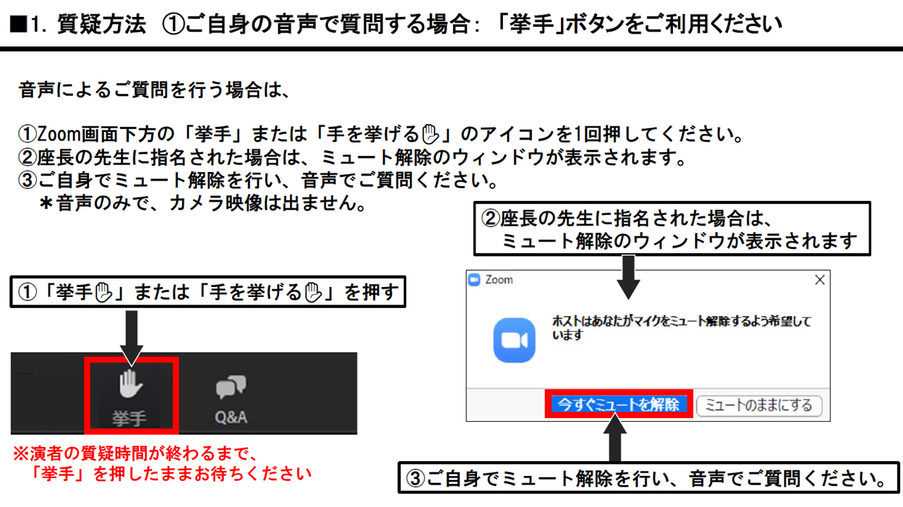 - ・座長・演者以外の参加者(視聴者)は、質疑応答の際に、座長に指名された場合に限り、音声による参加が可能となります。